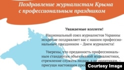 Сергей Томиленко, исполняющий обязанности председателя Национального союза журналистов Украины: «Мы поздравляем крымских журналистов с нашим общим праздником, желаем быть преданными профессии, служить не политикам, а правде и людям. Если этот долг исполнять, то нас не разъединят искусственные границы. К сожалению, прекратила деятельность крымская ячека Национального союза, но мы поддерживаем связь с каждым членом, мы открыты и хотим защищать права журналистов».