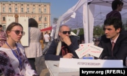 Неподалеку в палатке CentreUA обсуждали проблему крымскотатарских медиа и провели предварительный брейн-сторм для сбора идей по этому поводу.