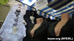 «Україна, АР Крим, м. Керч» все еще красуется на этикетке школьной формы для девочек а-ля Советский Союз. Однако цены уже российские. Черное платье с кружевными воротничками – 1300 рублей, белый фартук – 1100.