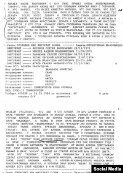 В документах, выложенных экс-президентом Крыма, также указано, что нынешний глава Крыма в 90-х был связан с организацией заказных убийств. Так, например, в одной из «оперативных сводок» говорится, что Аксенов может быть причастен к убийству начальнику теплосети Крыма Кузина, а в 1996-м он подыскивал людей, готовых «убрать» криминального авторитета «Васю Красногвардейского».