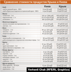 Пока же в Крыму решают, как сдерживать цены, мы решили сравнить их с киевскими. Расценки на полуострове мы составили на основании усредненных данных Крымстата и собственных наблюдений на рынках и в супермаркетах Симферополя. Поэтому ценовые данные по некоторым позициям могут быть ниже, чем они есть на самом деле.