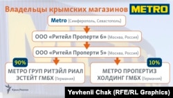 У предприятия более 30 видов деятельности, в основном – оптовая торговля продуктами, алкоголем и табачными изделиями. Дата регистрации – ноябрь 2014 года, то есть когда украинское представительство Metro уже ушло из Крыма и шел процесс оформления работы магазинов в Крыму под управлением российских компаний.
