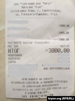 Покупки, которые сделали читатели Крым.Реалии в магазине Eva в Симферополе, подтвердили слова Семена Романова. Согласно полученному здесь чеку, магазин действительно принадлежит симферопольскому ООО «Торговый дом «Виза».