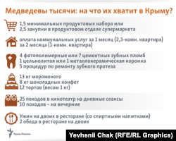 Вместе с тем, Крым.Реалии, на основании официальной информации Крымстата и публичных данных, подсчитали, на что можно потратить 5 тысяч рублей при нынешней экономической ситуации в Крыму.