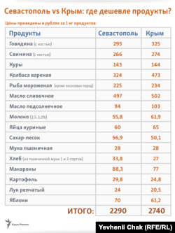 Овощи в Севастополе дороже общекрымских расценок на 4-5 рублей, а яблоки – почти на 9 рублей. Итого, разница в стоимости минимального перечня продуктов в Севастополе и Крыму составляет почти 450 рублей.