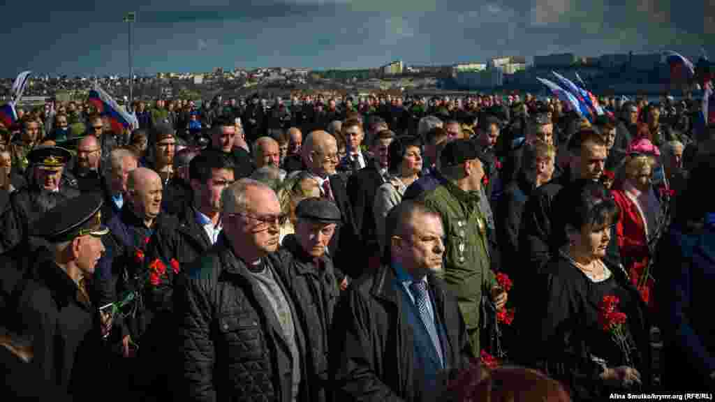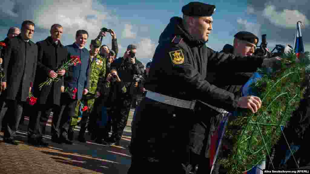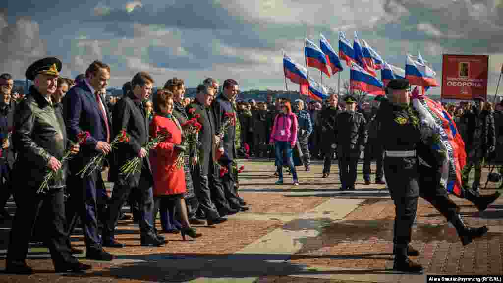 Возле памятника «Солдат и Матрос» в Севастополе прошел митинг, посвященный третьей годовщине «присоединения» Крыма к России. На мероприятии присутствовали местные чиновники, депутаты Госдумы РФ, члены Совета Федерации, а также лидер «путинских» байкеров Александр «Хирург» Залдостанов.