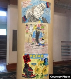 Вызывает большое сомнение то, что все те плакаты рисовали именно школьники. Наверное, как и в детсадах воспитатели, сами учителя, для сохранения рабочего места и зарплаты помогли врагу сеять вражду между людьми оккупированного Донбасса и свободной территории Украины.