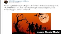 В открытом доступе Крым.Реалии нашли больше десяти объявлений от развлекательных заведений полуострова о проведении праздничных программ в ночь на 1 ноября. Некоторые уже отметили Хэллоуин несколькими днями ранее.