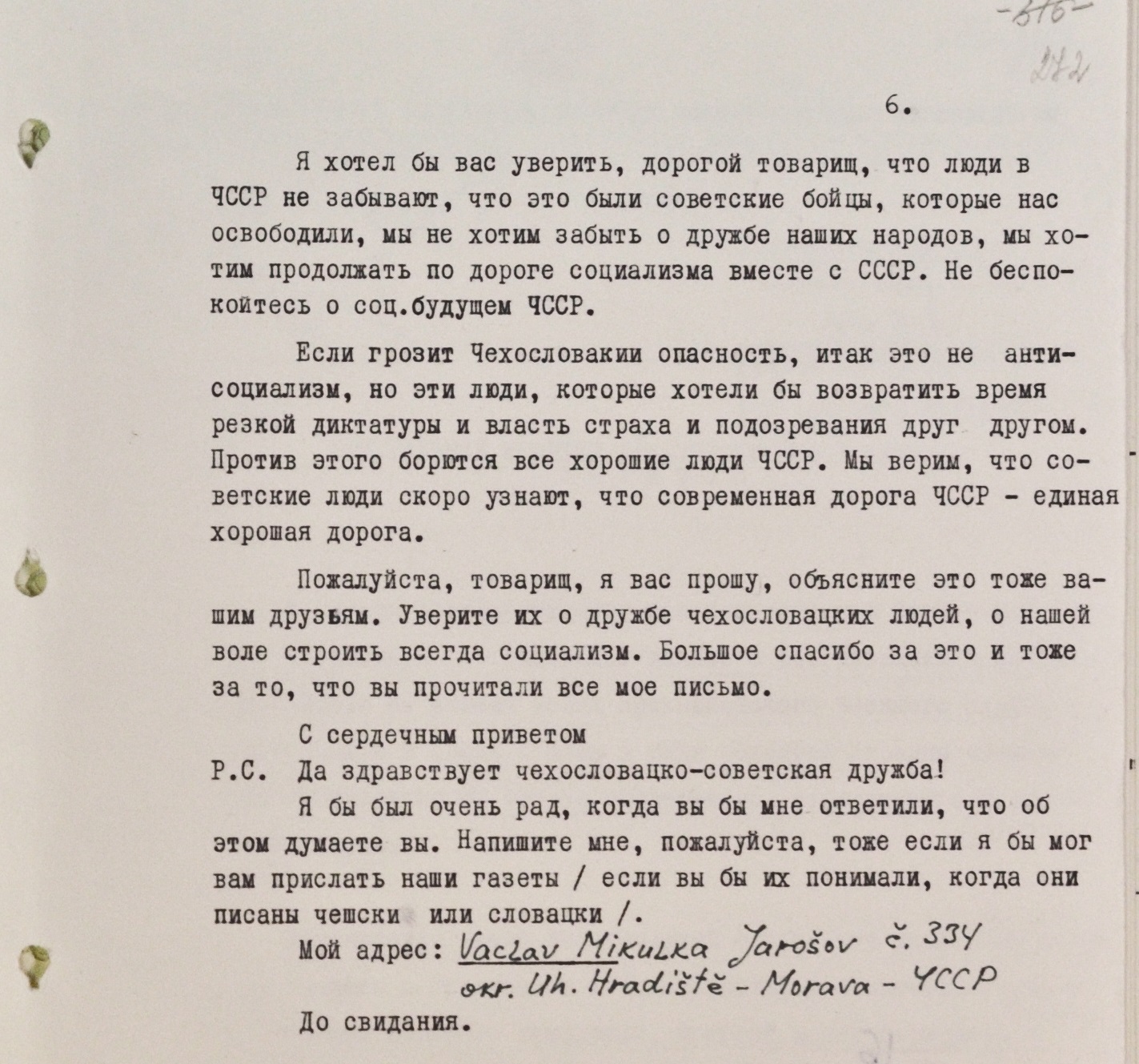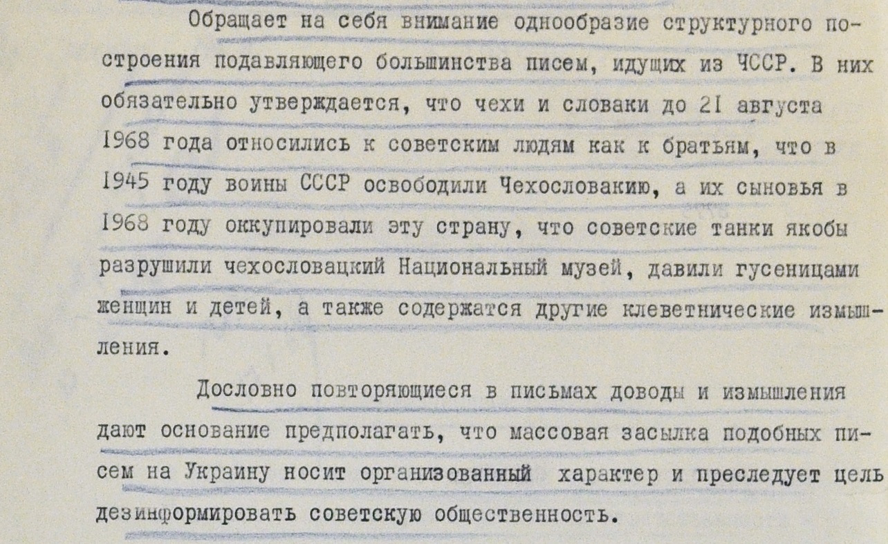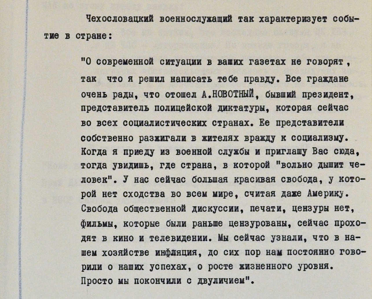 Если на ранних этапах Пражской весны в поле зрения чекистов попадали обычные письма друзьям и родственникам, то позже, летом, характер отбираемой корреспонденции меняется. Теперь чехословацкие граждане часто пишут в СССР с четкой целью: убедить, что происходящее у них – не контрреволюция, что никто не хочет отказываться от социализма и рвать отношения с восточным соседом. Видимо, люди верили, что это как-то спасет страну от военного вторжения.