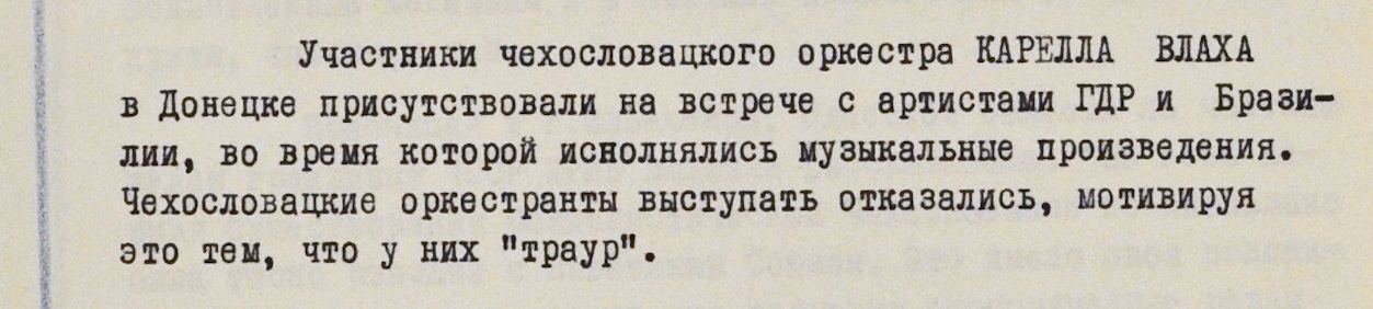 В конце августа в Украине выступал знаменитый чешский оркестр Карела Влаха. С ним было связано два инцидента, отмеченных в документах КГБ. На встрече с артистами ГДР и Бразилии в Донецке чехи отказались играть, пояснив, что у них траур.Трагикомичная ситуация произошла в Харькове. В гостиничном ресторане музыканты увидели красное знамя, которое вносили в банкетный зал, и засмеялись. Им объяснили, что готовится празднование юбилея освобождения Харькова от нацистов. “Мы думали, что вы торжествуете победу над Чехословакией”, – ответил один из артистов.