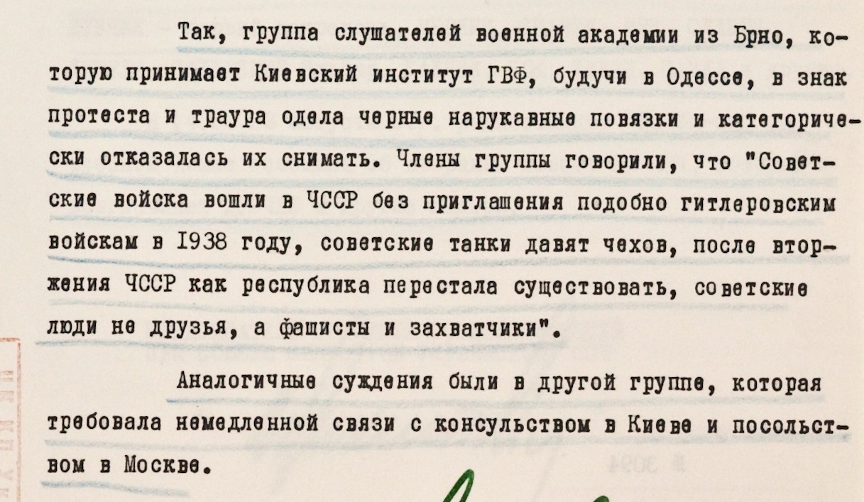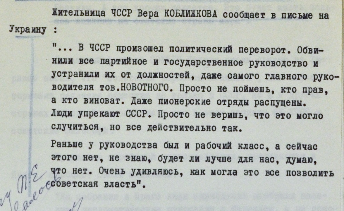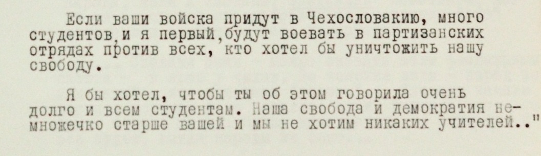 “Тревожным звоночком” для КГБ были намеки чехословаков на то, что советским гражданам стоило бы взять с них пример. Из письма жителя Праги Юрия Хары одесской девятикласснице: “Не могу понять, как это возможно, что у вас студенты ничего не сделали. У нас нашу революцию начали писатели, а мы, студенты и интеллигенция, несли дальше факел, а потом все рабочие”.