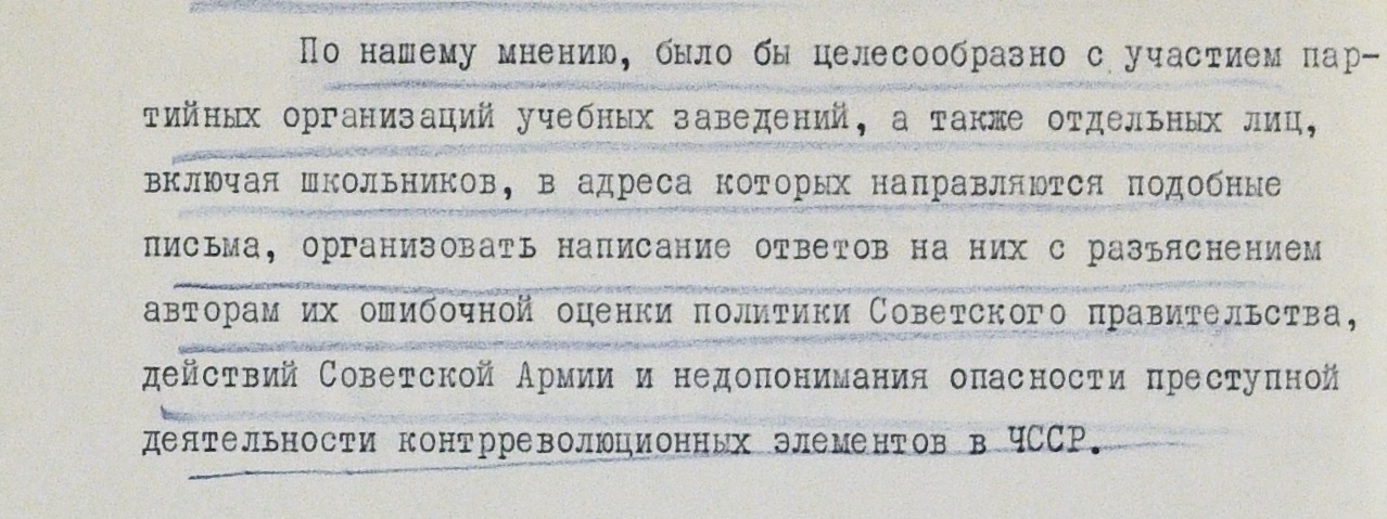 Подозревая, что массовая рассылка таких писем имеет организованный характер, КГБ предлагает при участии школьных парторганизаций устроить такое же массовое написание ответов “с разъяснением авторам их ошибочной оценки политики советского правительства, действий Советской Армии и недопонимания опасной деятельности преступных элементов в ЧССР”.