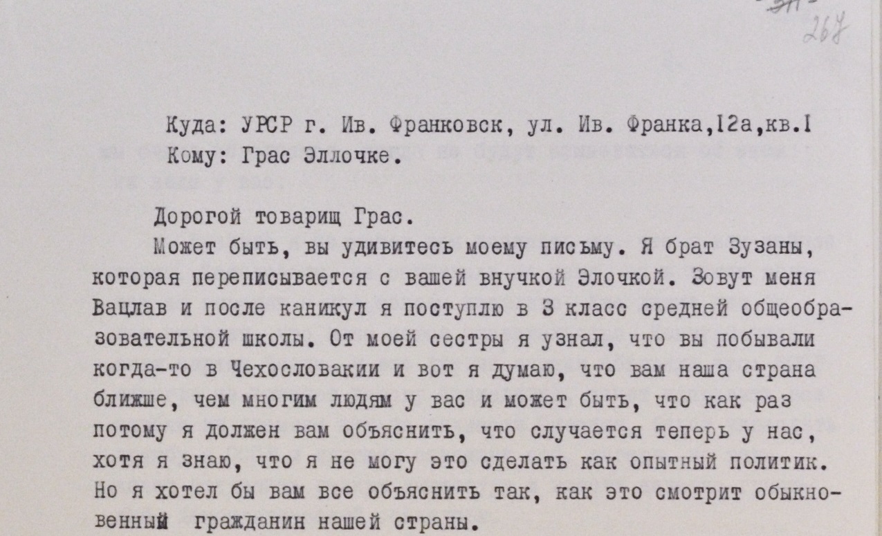 12-летняя Элла Грас из Ивано-Франковска дружила по переписке с Зузаной Микулкой из чехословацкого Угерске-Градиште. В июле 1968-го ей написал старший брат Зузаны, Вацлав. На конверте в качестве адресата была указана Элла, но текст начинался с фразы “Дорогой товарищ Грас” – автор обращался к дедушке школьницы.