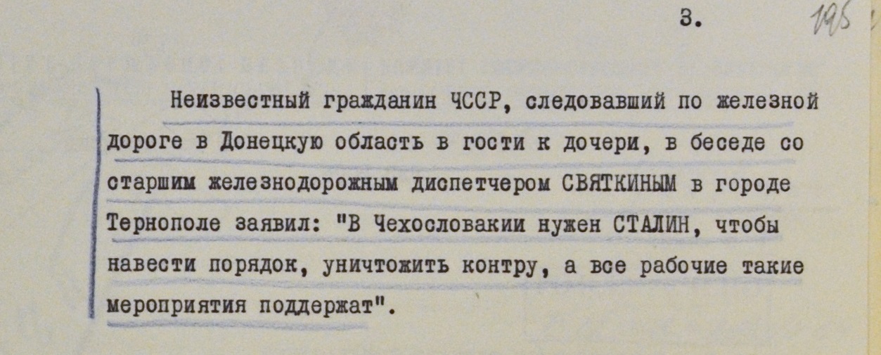 Некий житель ЧССР, ехавший поездом в Донецкую область, напротив, в разговоре изъявил желание прихода “Сталина”, который бы “навел порядок” и “уничтожил контру”.