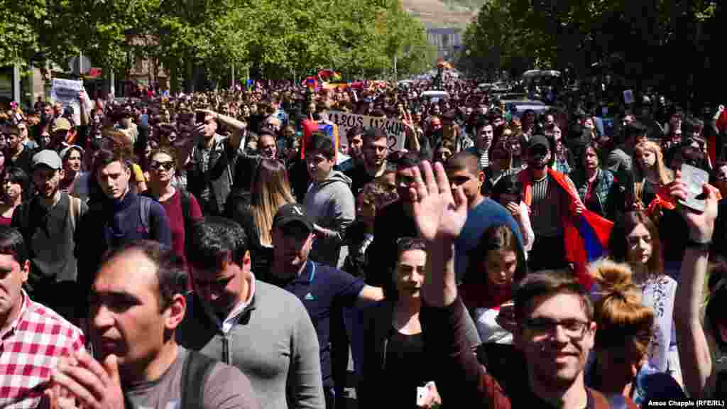 После ареста оппозиционного лидера Никола Пашиняна в Армении демонстрации не прекратились, несмотря на предупреждение полиции. Протесты в Ереване начались после того, как бывший президент страны Серж Саргсян решил стать премьер-министром, изменив конституцию и передав основные полномочия исполнительной власти в стране от президента премьеру. (Фотографии Амоса Чаппла, РСЕ/РС )