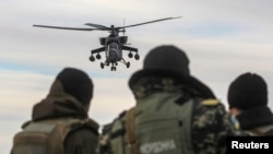 Украинские пограничники на Херсонщине наблюдают за российским вертолетом, 16 марта 2014 года