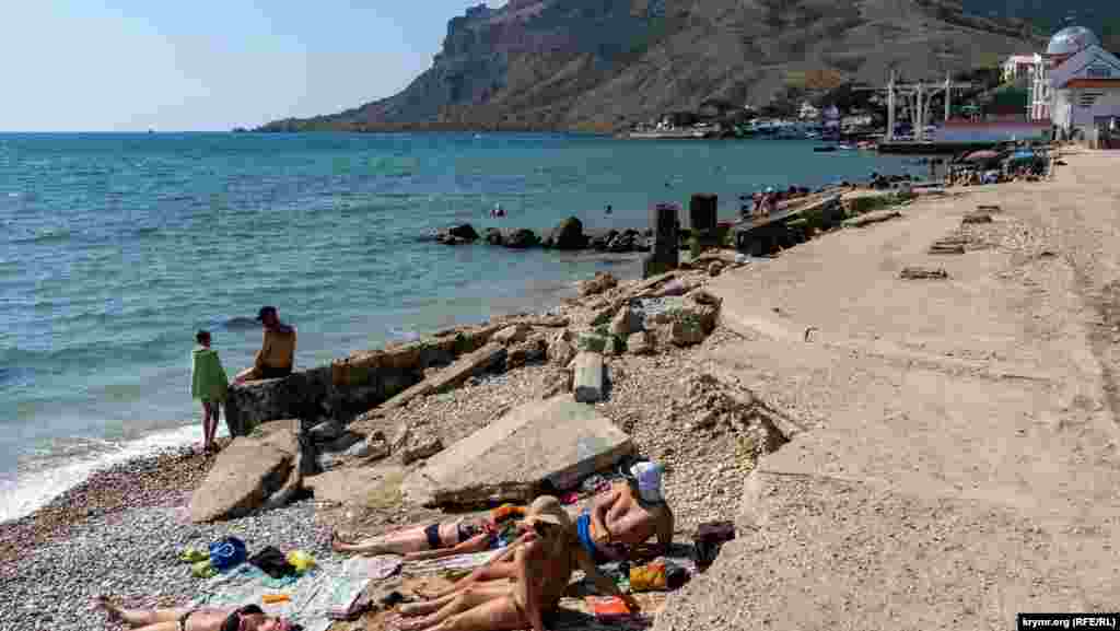 Если пройтись по набережной от улицы Десантников в направлении Кара-Дага, то взору откроется вообще картина полной разрухи, то есть аварийный пляж с нагромождением перевернутых бетонных плит, с торчащей из воды арматурой, обвалом асфальтового покрытия, где среди всего этого загорают и купаются взрослые и дети.
