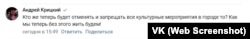 «Кто же теперь будет отменять и запрещать все культурные мероприятия в городе-то? Как мы теперь без этого жить будем?» – резюмирует Андрей Крицкий в паблике «Керчь – мой город».