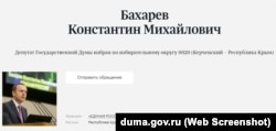 Такая же судьба постигла и Константина Бахарева – бывшего совладельца и главреда газеты «Крымская правда», экс-депутата крымского парламента, а теперь депутата Госдумы России, избранного по Керченскому округу.