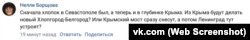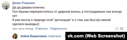 Есть и такие, кто паникует. «Сначала хлопок в Севастополе был, а теперь и в глубинке Крыма. Из Крыма будут делать новый «Хлопгород» – Белгород? Или Крымский мост сразу снесут, а потом Ленинград тут устроят?», – спрашивает Нелли Борщова.