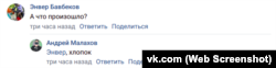 «А что произошло?» – интересуется подключившийся к беседе Энвер Бавбеков. «Энвер, хлопок», – отвечает ему Андрей Малахов.