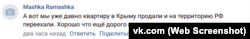 «А вот мы уже давно квартиру в Крыму продали и на территорию РФ переехали. Хорошо, что ещё дорого продали, теперь цены явно упадут», – делится радостью Mashka Ramashka.