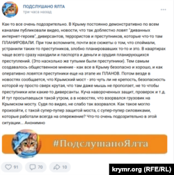 В сообществе «Подслушано Ялта» соцсети «Вконтакте» анонимный пользователь описывает реальную «эффективность» российских спецслужб: «Как-то все очень подозрительно. В Крыму постоянно демонстративно по всем каналам публиковали видео, новости, что так доблестно ловят «диванных интернет-героев», диверсантов, террористов и преступников, которые что-то там планировали. При том вспомните, почти все сюжеты о том, что поймали, устранили таких-то преступников, злобно планировавших то-то и это. В квартирах чаще всего сразу находили и паспорта и деньги и орудия планирующихся преступлений. (Это насколько же тупыми были преступники). Тем самым создавалось общественное мнение – как все в Крыму безопасно и хорошо, и как оперативно ловятся преступники еще на этапе их планов. Потом везде в новостях сообщается, что Крымский мост – это чуть ли не крепость, безопасность которой ну просто сверх крутая, что там даже мышь не проползет, не то чтобы преступники или какие-то диверсанты. Куча навороченных защит, проверок и т.д. И тут просыпаешься такой утром, а в новостях, что взорвался грузовик на Крымском мосту. Судя по видео, не слабо так взорвался. Как такое могло произойти, с такой супер-пупер защитой моста, с супер-пупер силовиками, которые работали всегда на опережение? Что-то очень подозрительно в этой ситуации...»