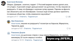 «Анастасия, лишнее не разрушить? Посмотри на Харьков, Мариуполь, Чернигов», – возмущается написанному Ира Коваленко.