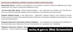 Крымские спасатели ранее обнародовали самые оползнеопасные места. В перечне – более трех десятков опасных точек вдоль Южного берега Крыма (от мыса Херсонес к мысу Фиолент и до бухты Ласпи, от мысов Ифигения, Кошка, Зеленого, Никита и ниже Кучук-Ламбадского хаоса), юго-восточного побережья (Алушта-Судак-Коктебель), западного побережья (от Радиогорки – Учкуевки и мыса Лукулл до поселков Угловое и Песчаное Бахчисарайского района, Берегового и Николаевки Симферопольского района и озера Кызыл-Яр Сакского района), а также Керченского полуострова.