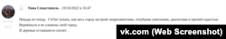 «Никуда не поеду. Стоит уехать, как весь город застроят апартаментами, «голубыми унитазами», «диалогами» и прочей гадостью. Вернешься и не узнаешь свой город. И деревья оставшиеся спилят», – пишет пользователь под ником Тина Севастополь.