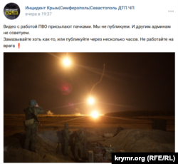 «Видео с работой ПВО присылают пачками. Мы не публикуем. И другим админам не советуем. Замазывайте хоть как-то, или публикуйте через несколько часов. Не работайте на врага», – написал администратор сообщества «Инцидент Крым|Симферополь|Севастополь ДТП ЧП» соцсети «Вконтакте» и проиллюстрировал сообщение архивным фото.