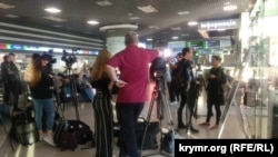 Как сообщает корреспондент Крым.Реалии, в аэропорту собрались журналисты РБК, «Наш», 1+1, UA:Крым, ATR и другие.