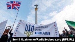 В центре Киева прошла акция в поддержку Украины, которая противостоит российской агрессии и находится под угрозой нового вторжения.