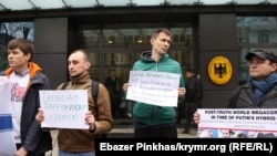В Киеве возле посольства Германии активисты организации «Родственники политузников Кремля» протестовали против снятия санкций с России в Совете Европы и ПАСЕ. Об этом сообщает корреспондент Крым.Реалии.