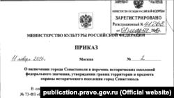 Министерство юстиции России зарегистрировало приказ Министерства культуры от 11 января 2016 года «О включении города Севастополя в перечень исторических поселений федерального значения, утверждении границ территории и предмета охраны исторического поселения город Севастополь».