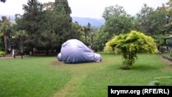 Как сообщает корреспондент Крым.Реалии, в сквере имени Калинина, недалеко от городской набережной, на газоне начали установку световой инсталляции в виде гигантской лампочки накаливания, которую местные жители назвали «памятником блэкауту».