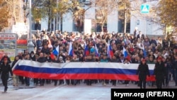 В Севастополе 4 ноября подконтрольные Кремлю власти Крыма провели демонстрацию бюджетников, пенсионеров и студентов по случаю российского праздника «День народного единства». Шествие сопровождалось песнями и маршами сталинского периода 30-50-х годов.