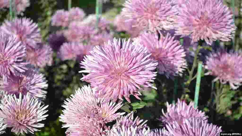 Сейчас в Никитском ботсаду происходит пик цветения всех видов хризантем: и мелкоцветковых, и крупных соцветий. Селекционеры сада выводят сорта самых разнообразных форм лепестков, оттенков соцветий и размеров цветков.