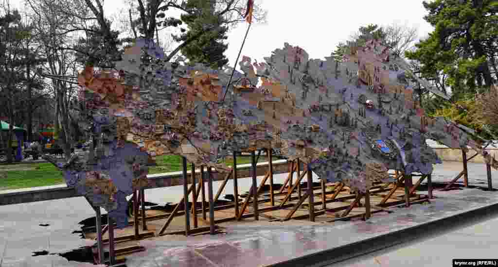 В Симферополе начала ржаветь кованая карта России. Ржавчина покрыла отдельные сегменты карты со стилизованными достопримечательностями регионов, в частности, Москвы, а также Тверской, Новгородской и Саратовской областей.