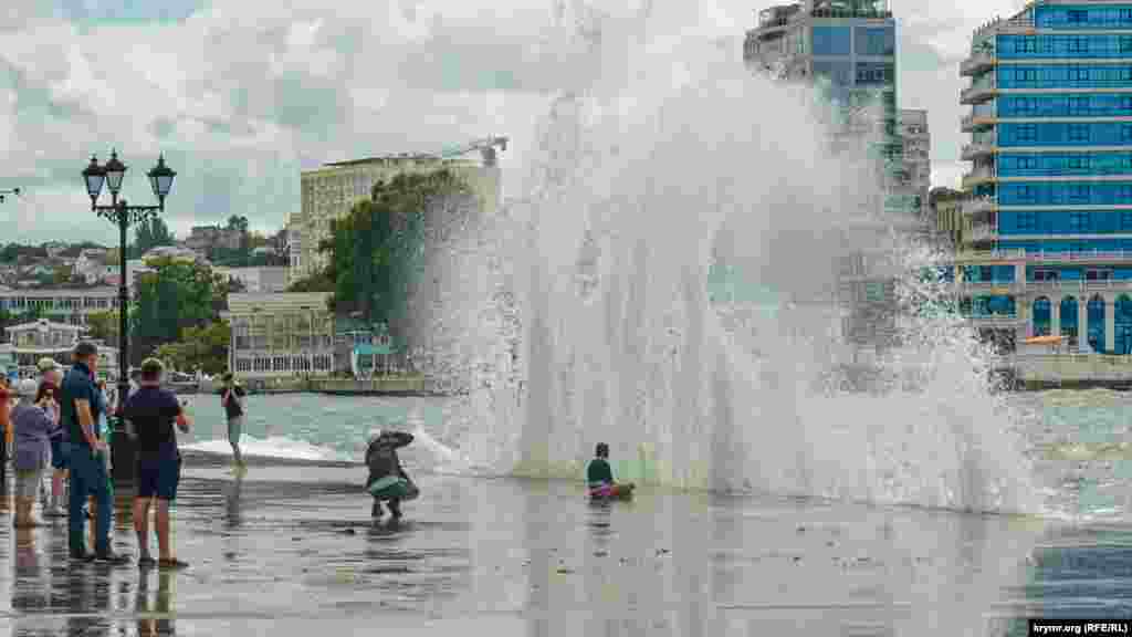 Севастопольскую бухту штормит. Из-за разбушевавшегося моря перестали ходить катера, но людей на городской набережной от этого не убавилось. Посмотреть на бьющие о берег волны собралось немало людей.