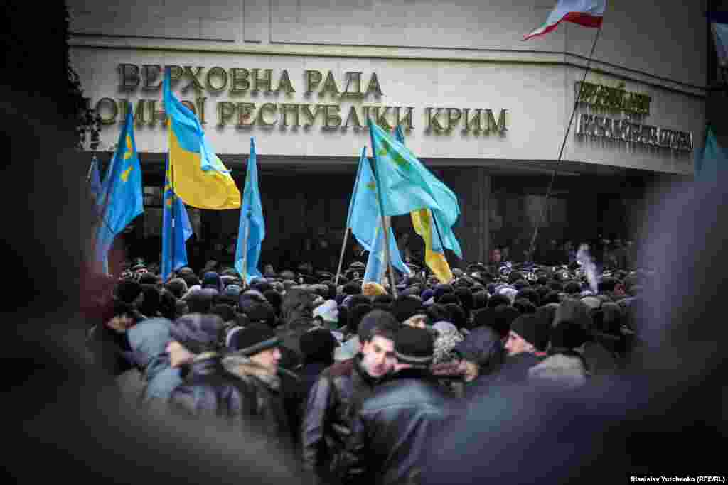 В Симферополе события могли бы развиваться по такому же сценарию. Однако проукраинским участникам митинга удалось добиться переноса сессии крымского парламента. Она состоялась на следующий день, 27 февраля. В захваченном российскими военными здании, под кураторством сотрудников российских спецслужб депутаты проголосовали за проведение «референдума», который впоследствии стал основанием для аннексии Крыма властями России.