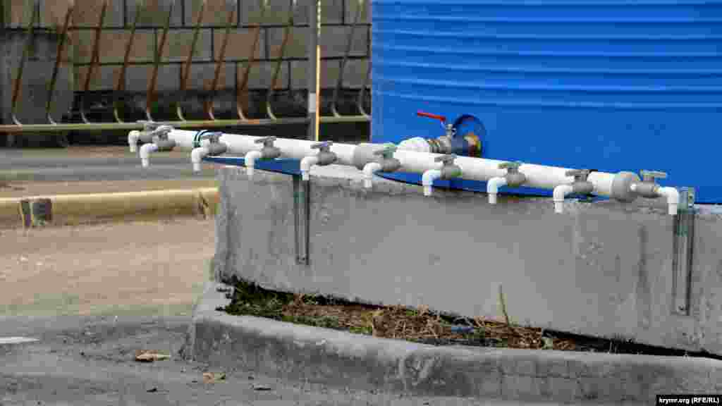 В разных районах Симферополя продолжается установка резервуаров для воды. Это огромные емкости синего цвета объемом 10 кубических метров. Всего в столице Крыма планируют установить более 130 таких бочек для обеспечения нужд населения в период действия режимного водообеспечения.