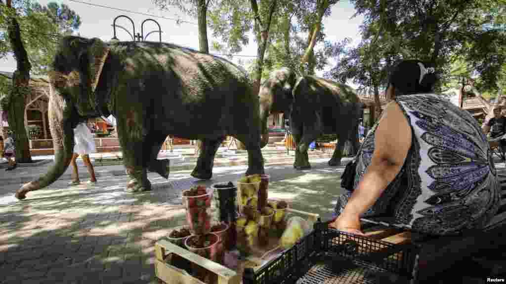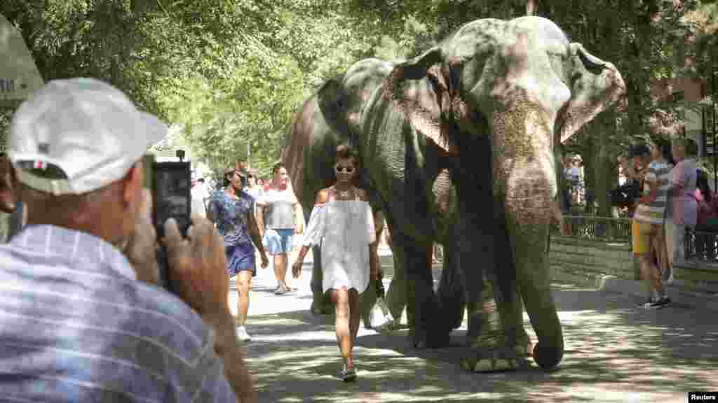 Два слона в сопровождении дрессировщика прогуливаются по улицам Евпатории. Это артисты передвижного цирка, который приехал с гастролями в город. Периодически животных приводят на пляж. Слоны с удовольствием купаются в Черном море, а туристы и местные жители наблюдают за этим.