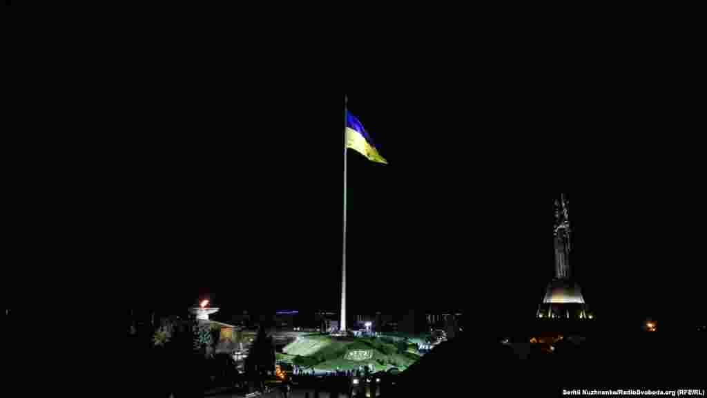 В Киеве вечером 22 августа, в преддверии Дня Государственного Флага Украины, подняли главный стяг страны. Он будет развиваться на высоте 90 метров над Печерскими холмами – именно столько составляет длина флагштока.