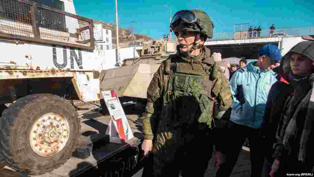 По информации корреспондента Крым.Реалии, вместе с передвижной выставкой в Севастополь приехали представители правительства Сирии. Два десятка сирийцев устроили импровизированный флешмоб: залезли на броневик и с криками «УРА!» размахивали российскими и сирийскими флагами.