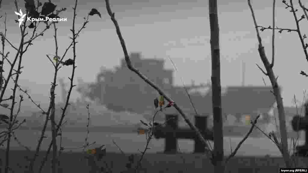 Несмотря на сильный туман, накрывший утром Керчь, журналистам Крым.Реалии удалось сфотографировать украинские военные корабли. На некоторых фото видна часть номера катера «Бердянск», закрытого маскировочной сетью.