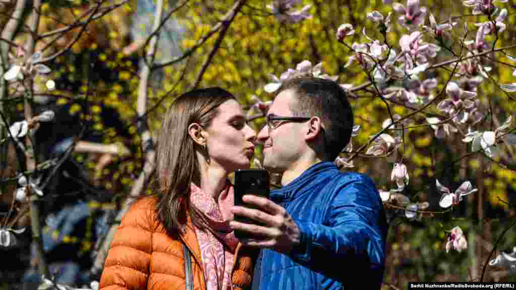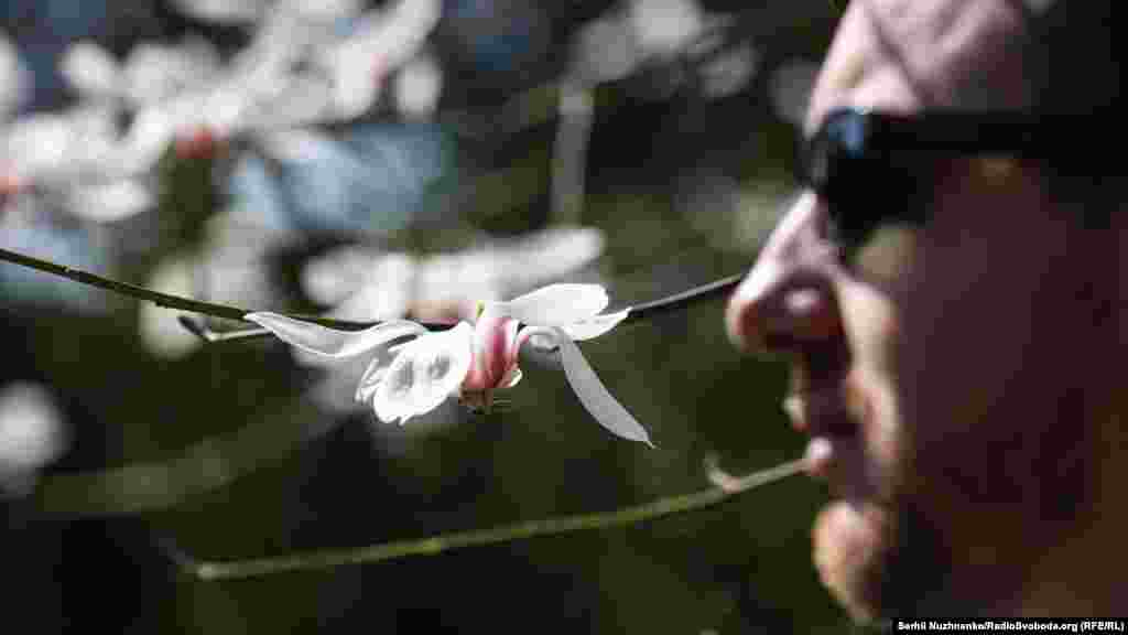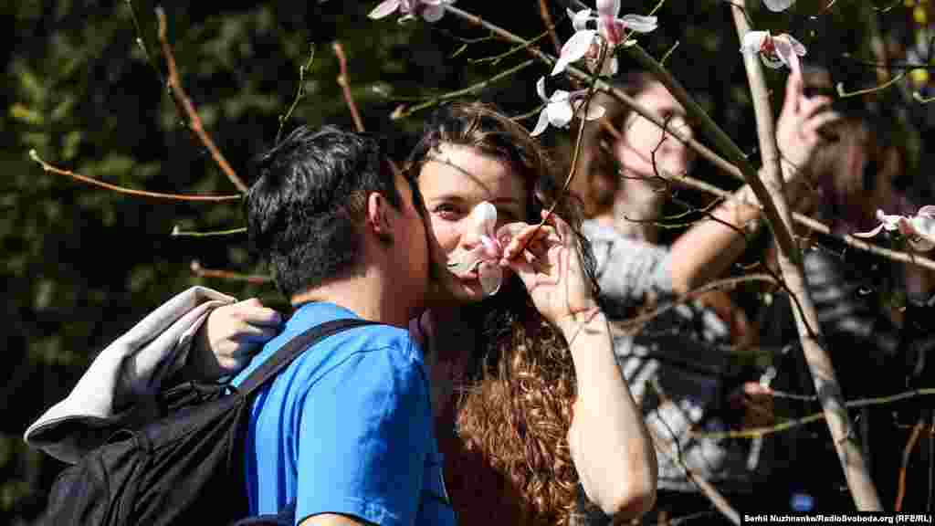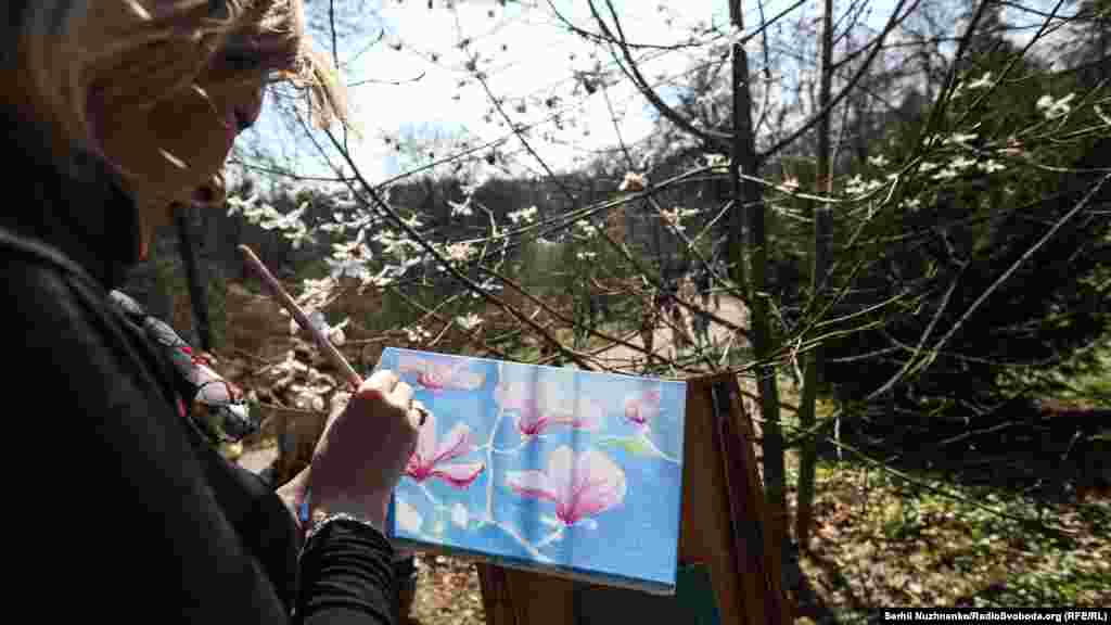 В киевском ботаническом саду имени Фомина расцвели магнолии. Пока цветы появились лишь на трех деревьях, цветение остальных магнолий ожидается во второй половине апреля. Посетители сада наслаждаются ароматом, делают «Селфи» на фоне кустов, а художники рисуют пейзажи с цветущими деревьями прямо с натуры. Но, к сожалению, не все посетители заботливо относятся к цветам. Время от времени на земле у магнолий появляются оборванные лепестки.