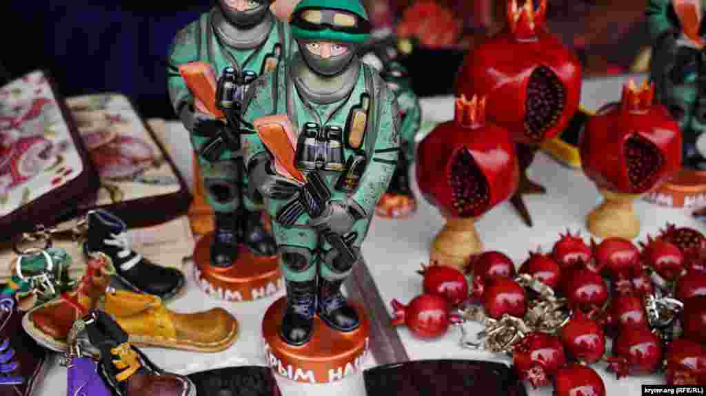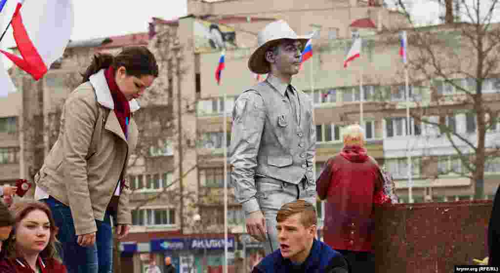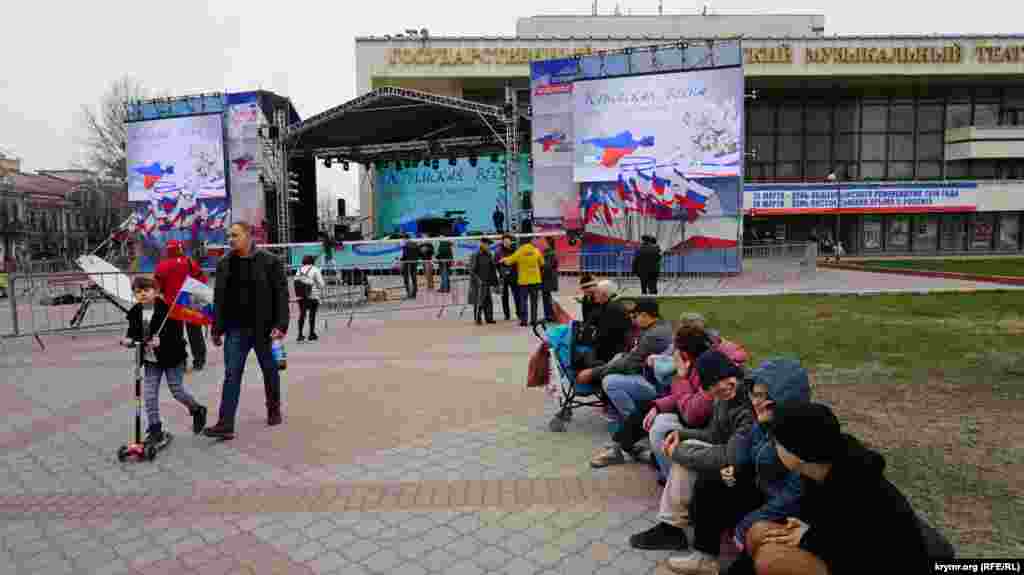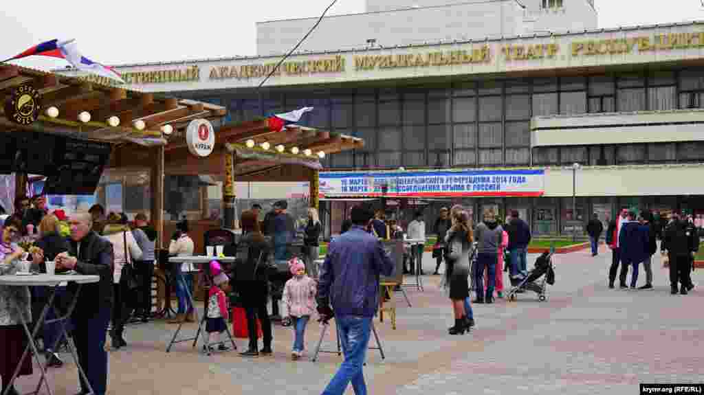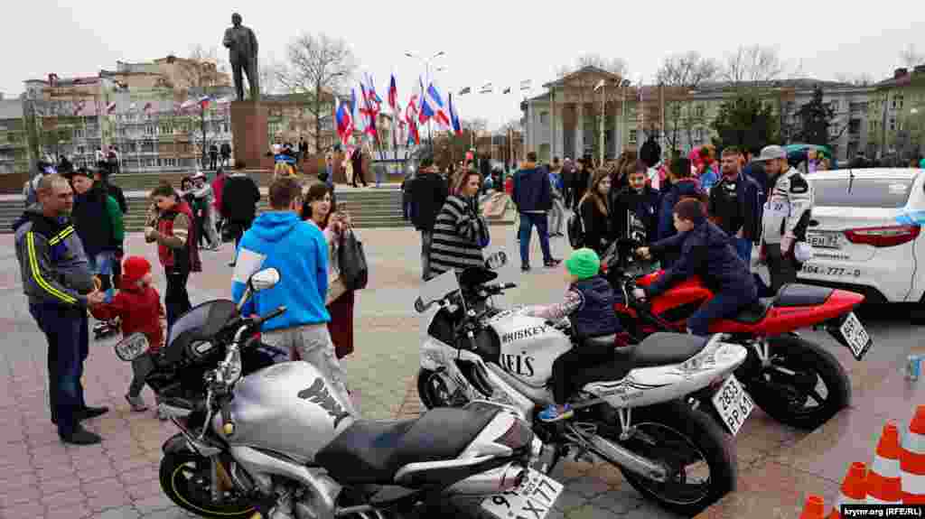 На площади Ленина в Симферополе в честь «годовщины референдума» устроили ярмарку: развернули торговые палатки с сувенирной продукцией и патриотической символикой. Детей развлекали аниматоры: показывали им авиамодели и мотоциклы.