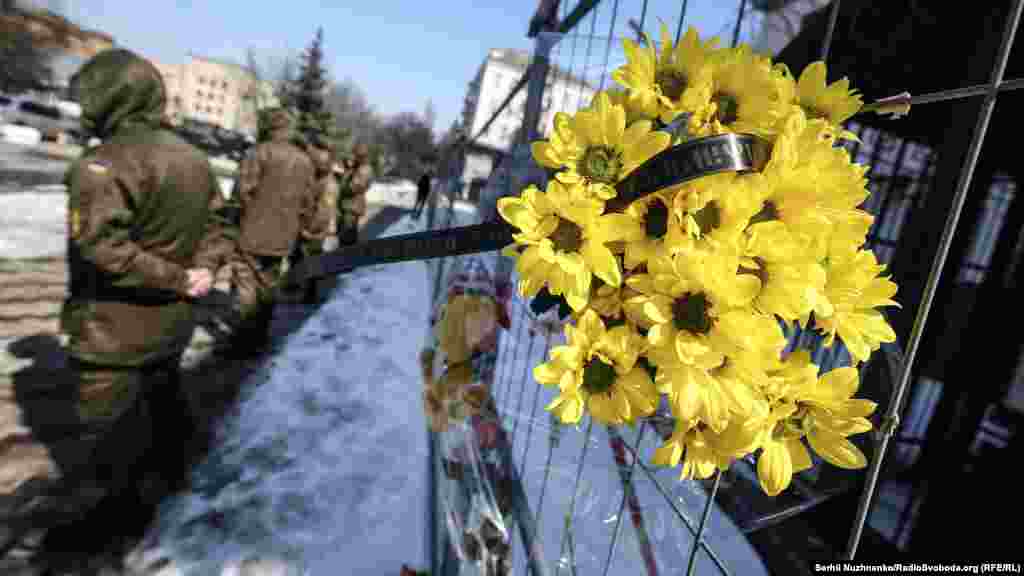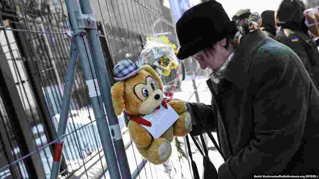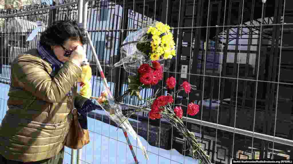 Киевляне несут цветы и игрушки к зданию посольства России в память погибших в трагедии.