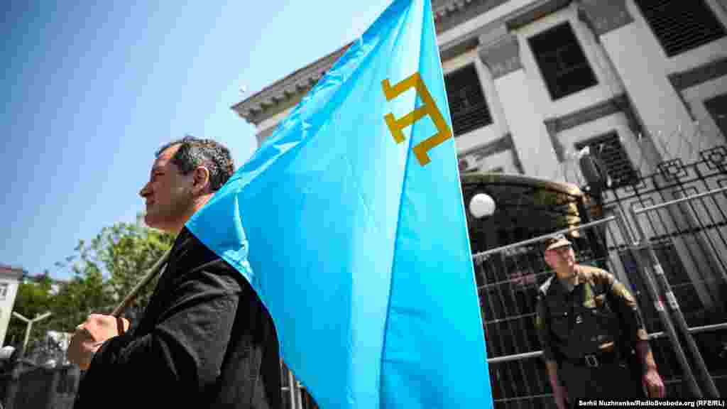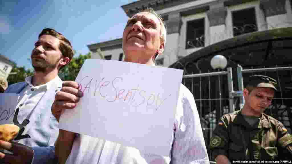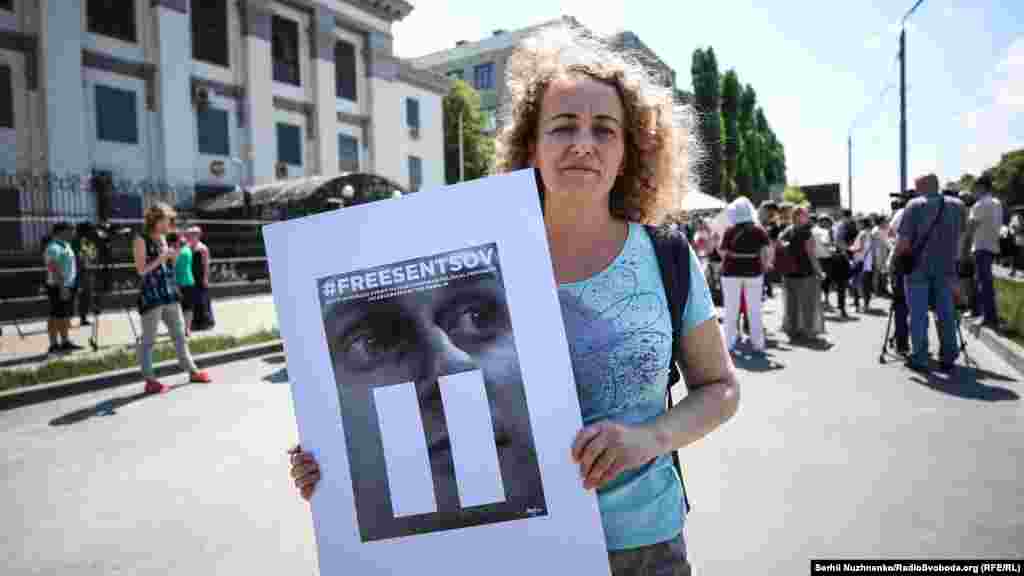 В Киеве у здания посольства России в Украине 24 мая прошла акция в поддержку украинского политзаключенного Олега Сенцова, который 14 мая объявил голодовку, находясь в колонии российского города Лабытнанги.